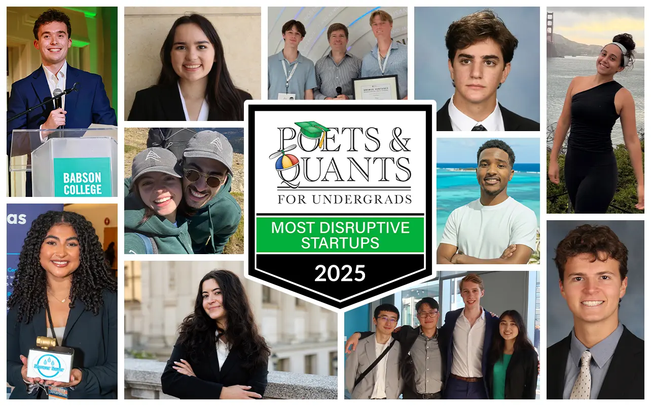 Most Disruptive Business School Startups Of 2025 by: Jeff Schmitt on January 05, 2026 | 539 Views January 5, 2026 Copy Link Share on Facebook Share on Twitter Email Share on LinkedIn Share on WhatsApp Share on Reddit Remember starting college? It was quite the transition. New people and bigger demands. If you were a starting midfielder in high school, you were glued to the bench come freshman year. If you were an A-student in AP courses, you pulled B’s in college Gen Eds. On your own for the first time, you struggled to keep pace. You endured late nights, tight budgets, and failed relationships. All the while, you probably felt lost and alone, wondering if you’d made a mistake and truly belonged. Hannah Wissotzky experienced this same disorientation and loneliness when she started at UC Berkeley in 2023. Like many women, she felt “invisible” on a campus of 30,000 people. These difficulties inspired the entrepreneurial-minded Wissotzky to start a business venture: Quilly. Rather than developing “another swipe-based friendship app,” Wissotzky took a more intimate approach. She used personality assessments and “AI-powered group leaders” to place like-minded students together in “intentional virtual houses.” In the end, Wissotzky’s solution upends the traditional social networking platform to create what she calls “a home away from home.” Quilly is just one of the 22 student startups honored by Poets&Quants in its 5th annual Disruptive Startups series. Focused on ventures launched by undergraduate business majors, the startups were chosen from 31 of the highest-ranked business programs according to Poets&Quants’ 2025 Undergraduate Business School Ranking. This year’s list features startups launched out of schools ranging from Babson College to the University of Michigan to the Wharton School. FROM ROBOTICS TO PROPERTY MANAGEMENT, A WEALTH OF IDEAS Consumer products, healthcare and education are the most dominant sectors for startup activity among these ventures. However, these these student entrepreneurs have also gravitated to a wide range of industries as different as robotics, property management, fintech, and public service. Many of the companies were spawned by personal experience. Wissotzky’s startup at Berkeley is emblematic of the smart ideas percolating out of business school students these days. “Quilly helps girls form real friendships through spontaneous and planned hangouts, safety check-ins, shared resources, and a points system that encourages mutual support,” Wissotzky tells Powets&Quants. “The goal isn’t to keep people on their phones, it’s to get them out of their dorm rooms and into real life with people who genuinely show up for them.” Hannah Wissotzky, Quilly TAPPING INTO THE LARGER UNIVERSITY Thus far, Wissotzky has funded Quilly with $3,500 in competition winnings, with the intent to open a seed round in February. Starting with a chapter at UC Berkeley, the venture now reaches 5-million people per month on Instagram. Two months ago, Wissotzky booked Sophie Silva and James Clark – who boast a combined 14-million followers – onto her podcast. She even established a partnership with a self-defense alarm company to host a party that attracted 500 women. More than that, she has honed her platform’s functionality by conducting over 100 user interviews. Beyond the individual stories, there is a larger narrative beyond campus that fuels Quilly, adds Wissotzky. “All of this sits against a backdrop of national research: the U.S. Surgeon General naming loneliness a public health crisis; Gen Z women reporting the highest loneliness rates; and the rise of “rotting culture,” where we isolate behind our screens because showing up in real life feels too intimidating.” College-aged women aren’t the only driving forces behind Quilly. Wissotzky points to the larger UC Berkeley ecosystem, particularly the Haas School of Business, for providing the resources that have set her venture up for success. “Berkeley has been the best place imaginable to build Quilly,” she continues. “They included professors who opened doors; PhD students researching loneliness who let me interview them for insight; pitch competitions recommended and reviewed by professors; mentors at the eHub; and classmates who tested early prototypes. This ecosystem has pushed Quilly forward at every step. Berkeley doesn’t just give you resources. It gives you urgency, accountability, and people who genuinely want to see you build something meaningful.” Joe Poole, Brain Battle LEVELING THE PLAYING FIELD FOR TEST-TAKERS Not surprisingly, student entrepreneurs found inspiration (and gaps) in Education. That starts with Brain Battle, a venture launched by Joe Poole out of Washington University’s Olin School. Targeting the SAT and ACT preparation market, Brain Battle replaces expensive tutors and rote drilling with a mobile game that enables users to “compete live against peers, track progress, [and] unlock rewards.” For Poole, the solution applies the gamified bells-and-whistles that students enjoy and leverages it to enhance learning performance. “Brain Battle takes the same elements that keep them hooked—streaks, leaderboards, rewards, and community—and uses them to fuel learning instead. The result is studying that feels addictive in the best way, helping students at every level gain consistency, confidence, and motivation.” For Poole, who was recognized in 2025 as an Inno Under 25 recipient, Brain Battle is a means to democratize learning. He was struck by how high-income households scored 200 points higher on the SAT than low-income counterparts. He posits that high test scores are based on privileges such as “$100-an-hour tutors, prep classes, and better schools.” To level the field, he employs a tool carried by 95% of teens – a smartphone. As a result, Poole explains, the best test prep is available to anyone at any time. This access,